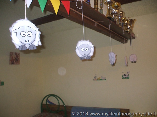 Per le decorazioni potete sbizzarrirvi come volete. Io ho creato una sagoma di fattoria inglese con dei cartoncini ruvidi Bristol, ritagliandone le parti e incollandole con il vinavil. Poi ho stampato diversi animali da cortile formato grande e li ho ritagliati incollando dietro la sagoma dell’erba, sempre ritagliata dal cartoncino. Ho attaccato le varie decorazioni sui muri. Ho anche creato delle bandierine colorate infilate in un filo lungo più di 3 mt. Poi ho creato delle pecorelle, mucche e capre ritagliando il cartoncino stampato e incollando un po’ di ovatta per dare l’effetto “lana”. Gli animaletti li ho appesi a lampadari e travi di legno. E per finire tanti palloncini.