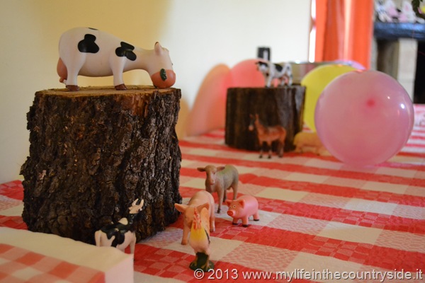 Il tavolo l’ho apparecchiato con una tovaglia a quadretti bianco e rossi e ho posizionato sul tavolo ritagli di dischi di legno (tutti presi in campagna) e animaletti della fattoria giocattolo.