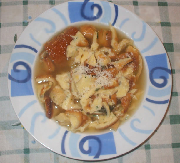 O caldo já está pronto: filtrá-la e reserve a carne e as cenouras, que será temperado com azeite e sal e comido como um segundo. A crosta parmesão que irá ter sabor do caldo, Pode ser consumido no caldo junto com panquecas cortadas. Adicione água para o caldo vai se tornar mais estreito e sal mais regular. Coloque para ferver. Coloque o omelete, previamente cozido no forno, em uma placa de corte de madeira e corte em tiras finas tantos, jogá-los no caldo e mantê-los por um minuto em um pote de fogo off, o tempo de imersão, mas sem descartar.
